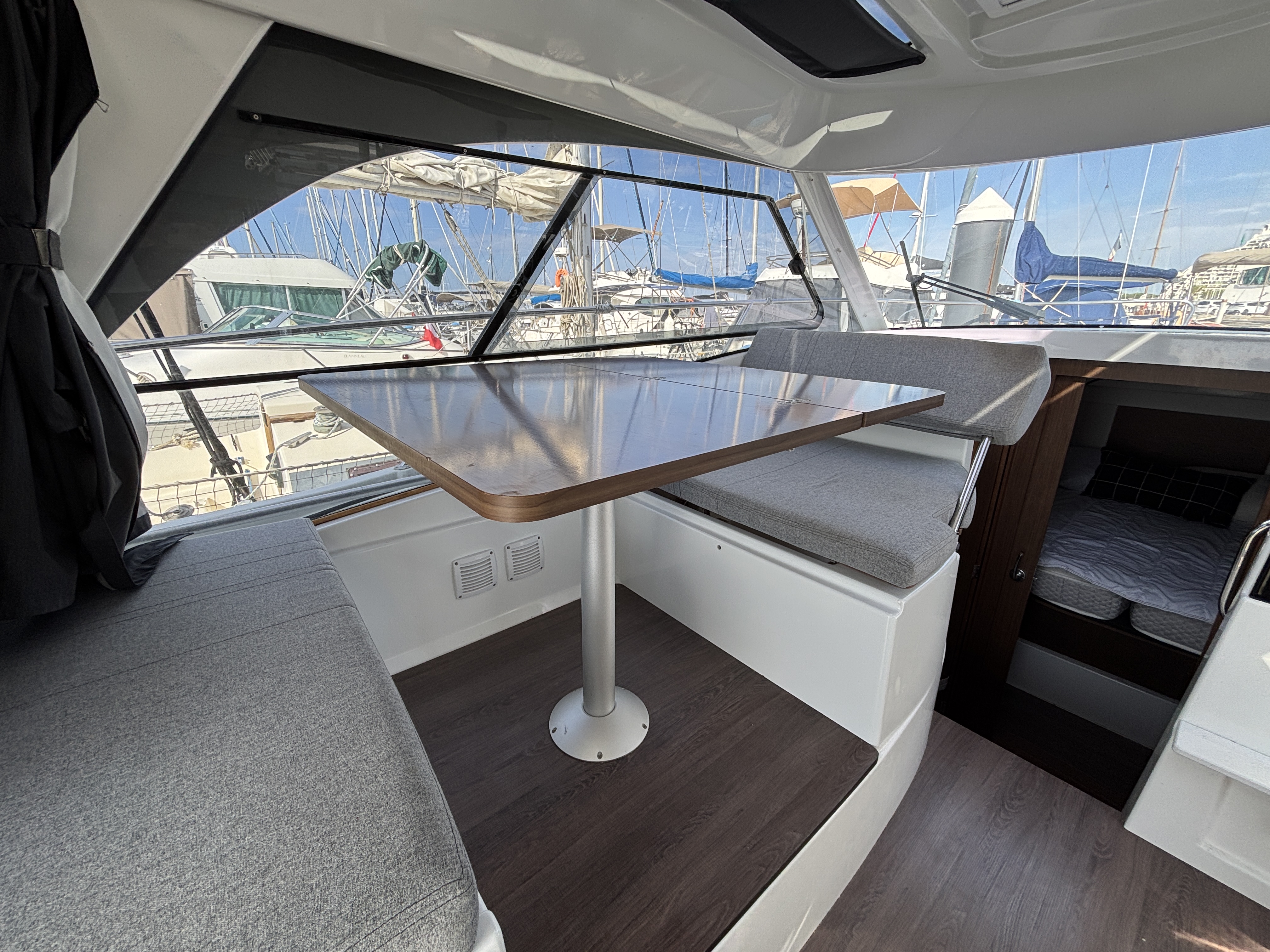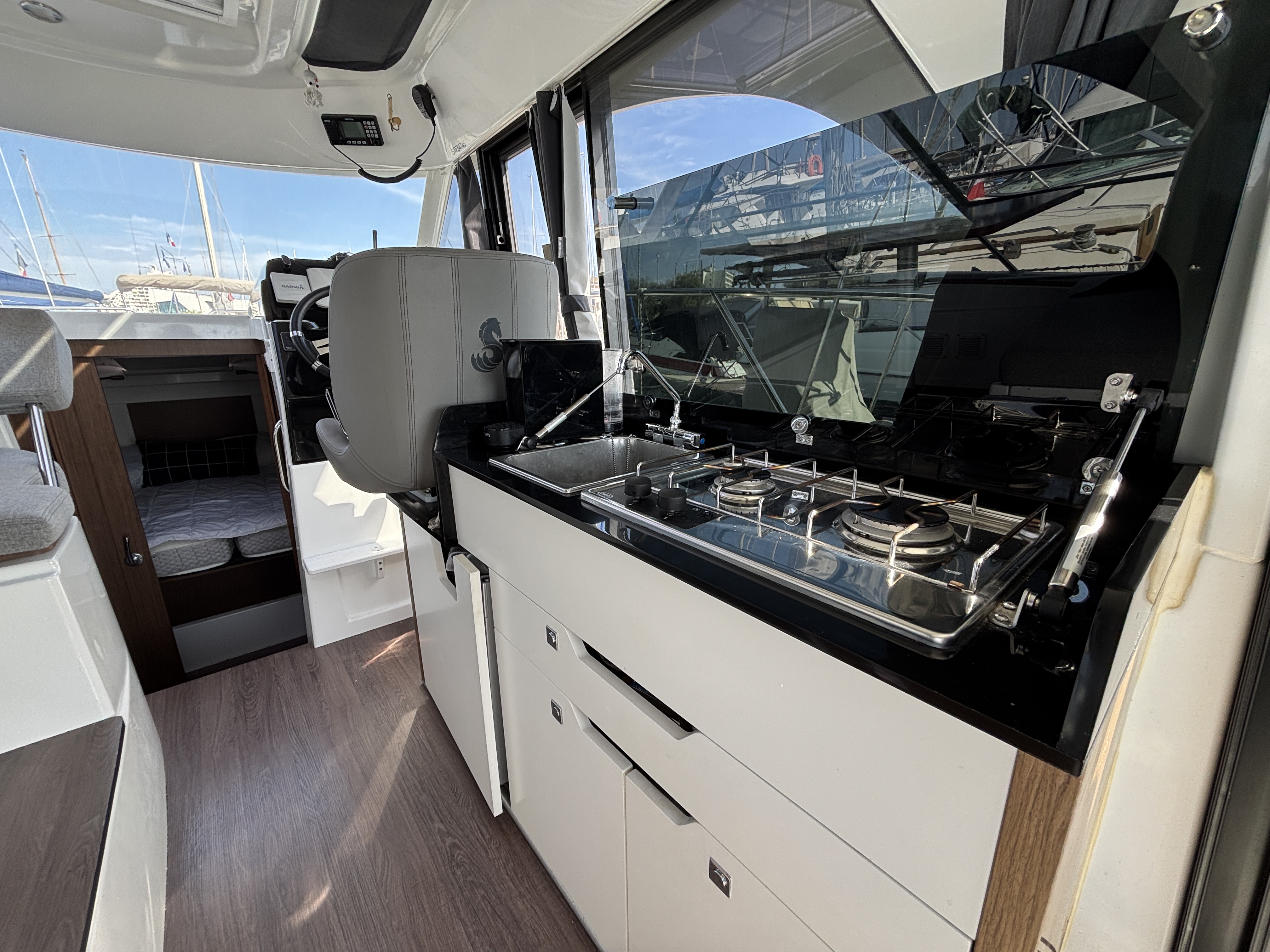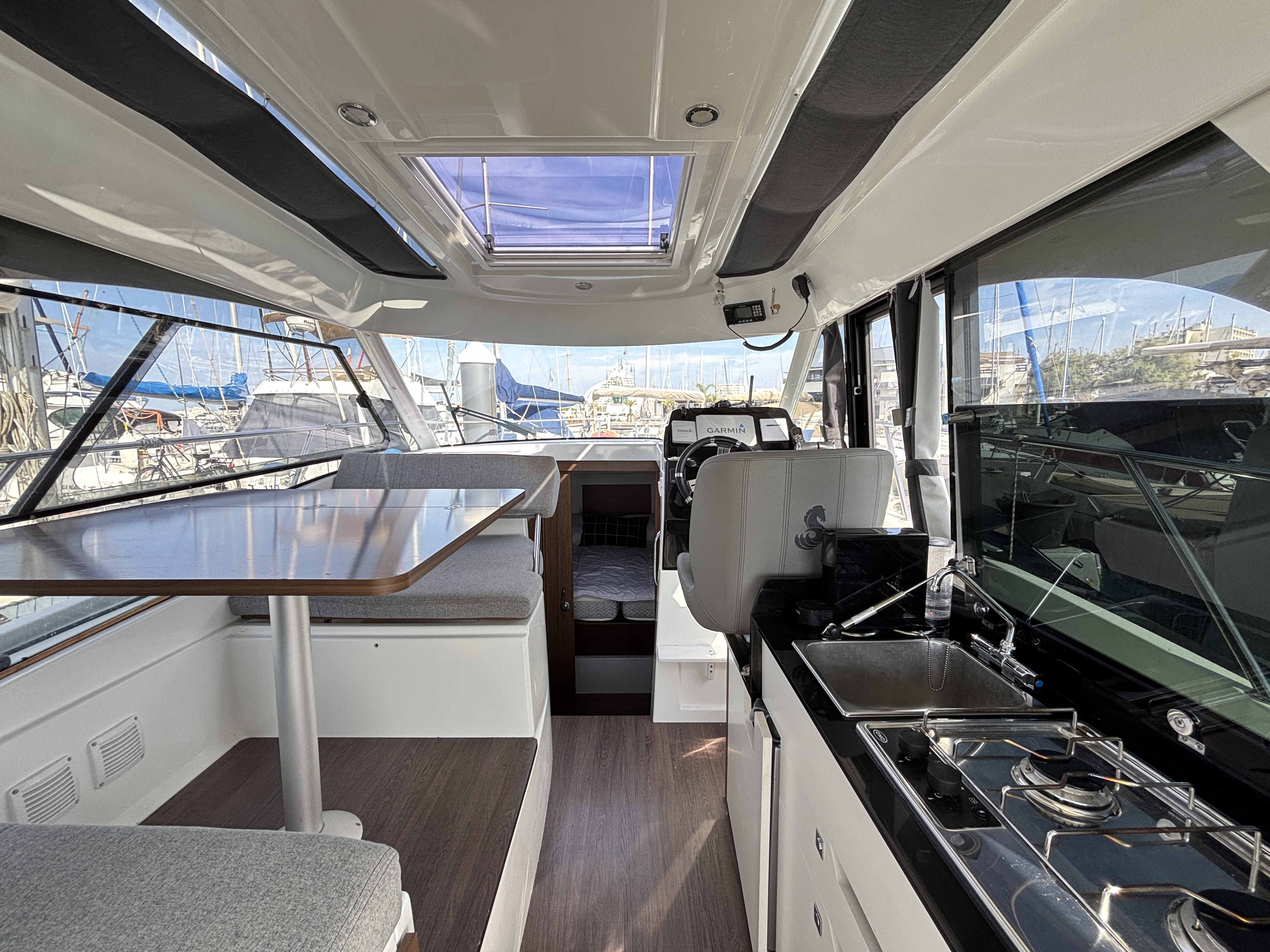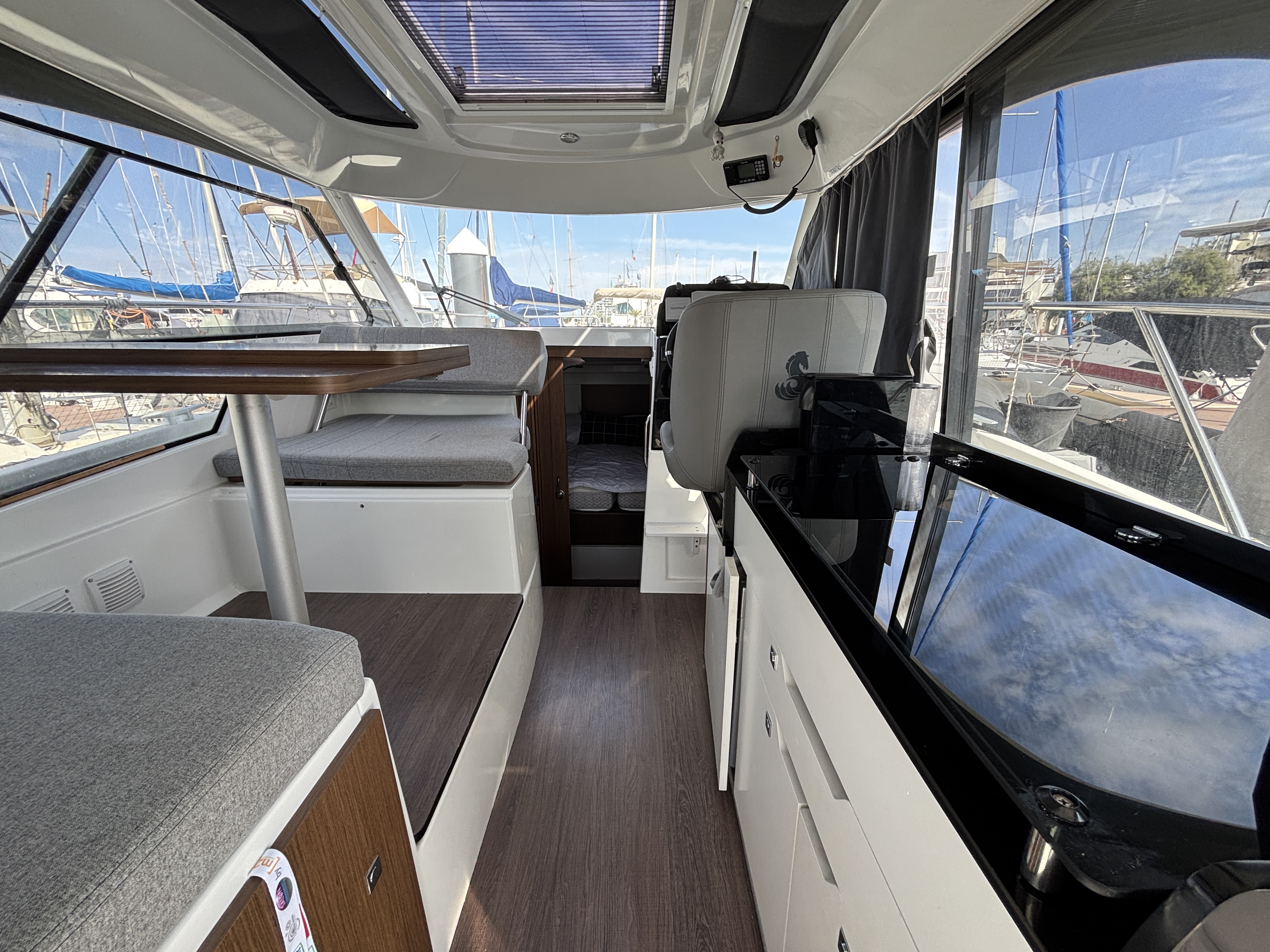L’espace intérieur est lumineux et confortable avec carré transformable, cuisine équipée et cabine double, offrant un véritable confort de croisière. Cockpit modulable parfait pour la pêche ou la détente.