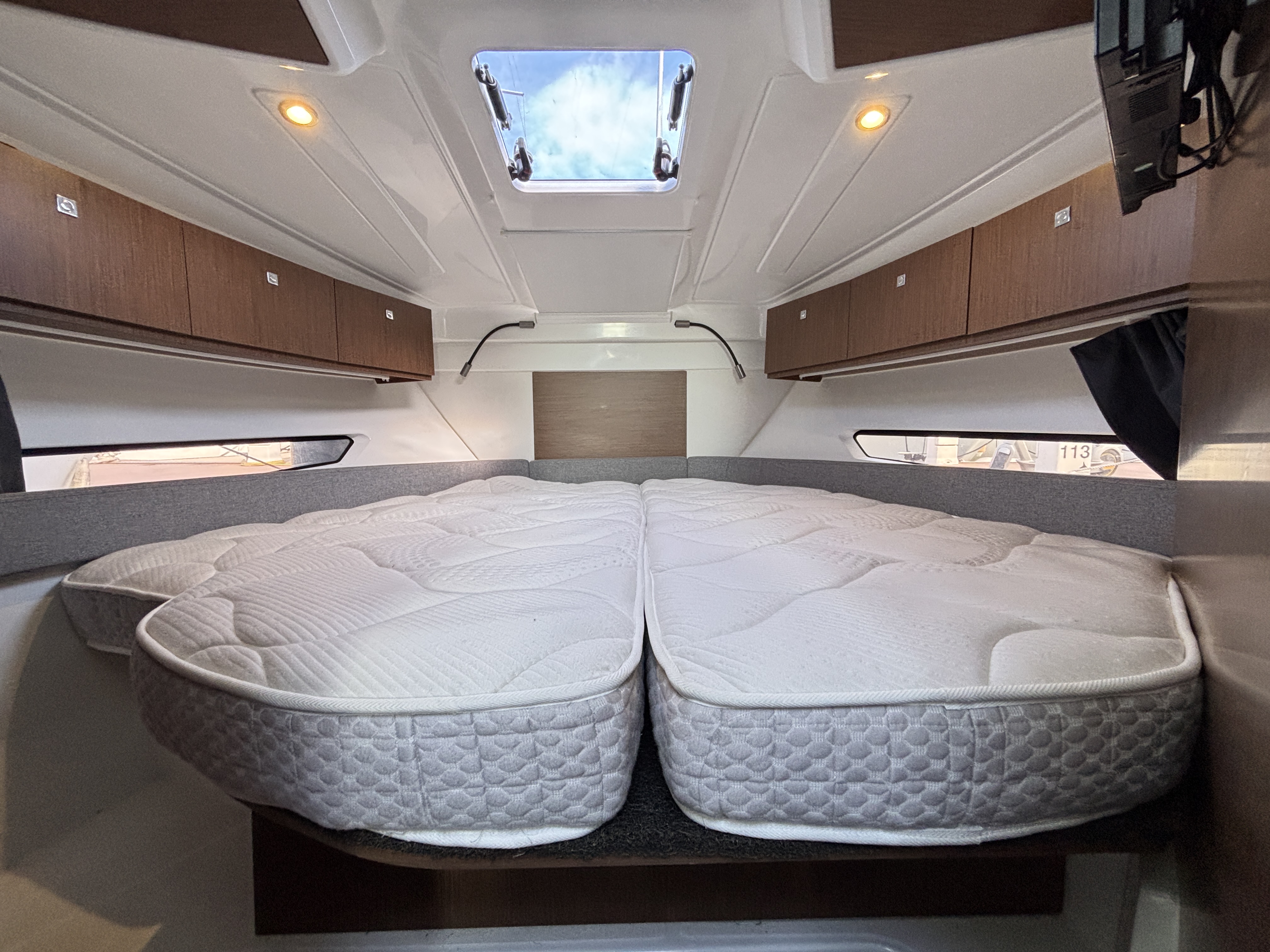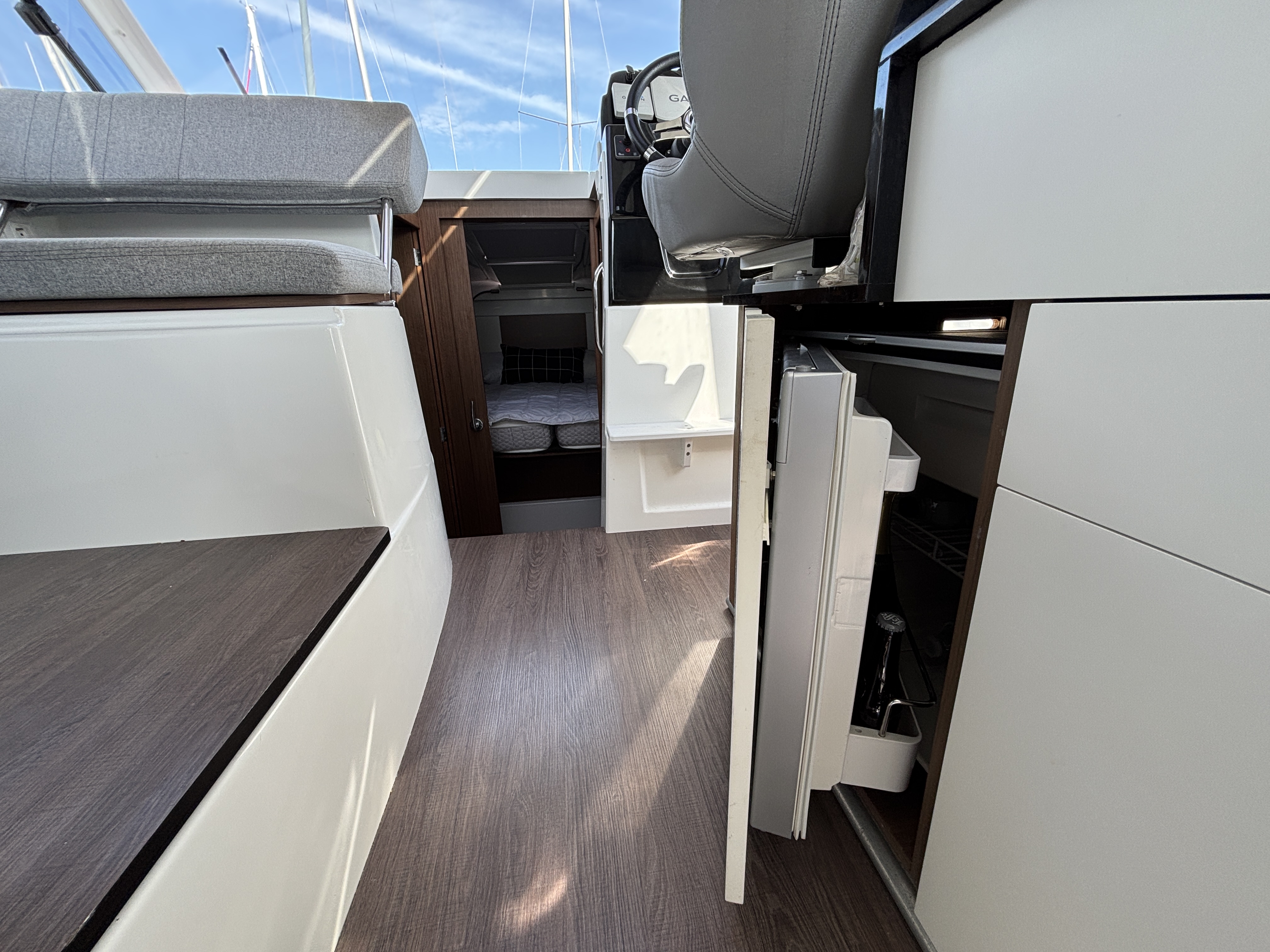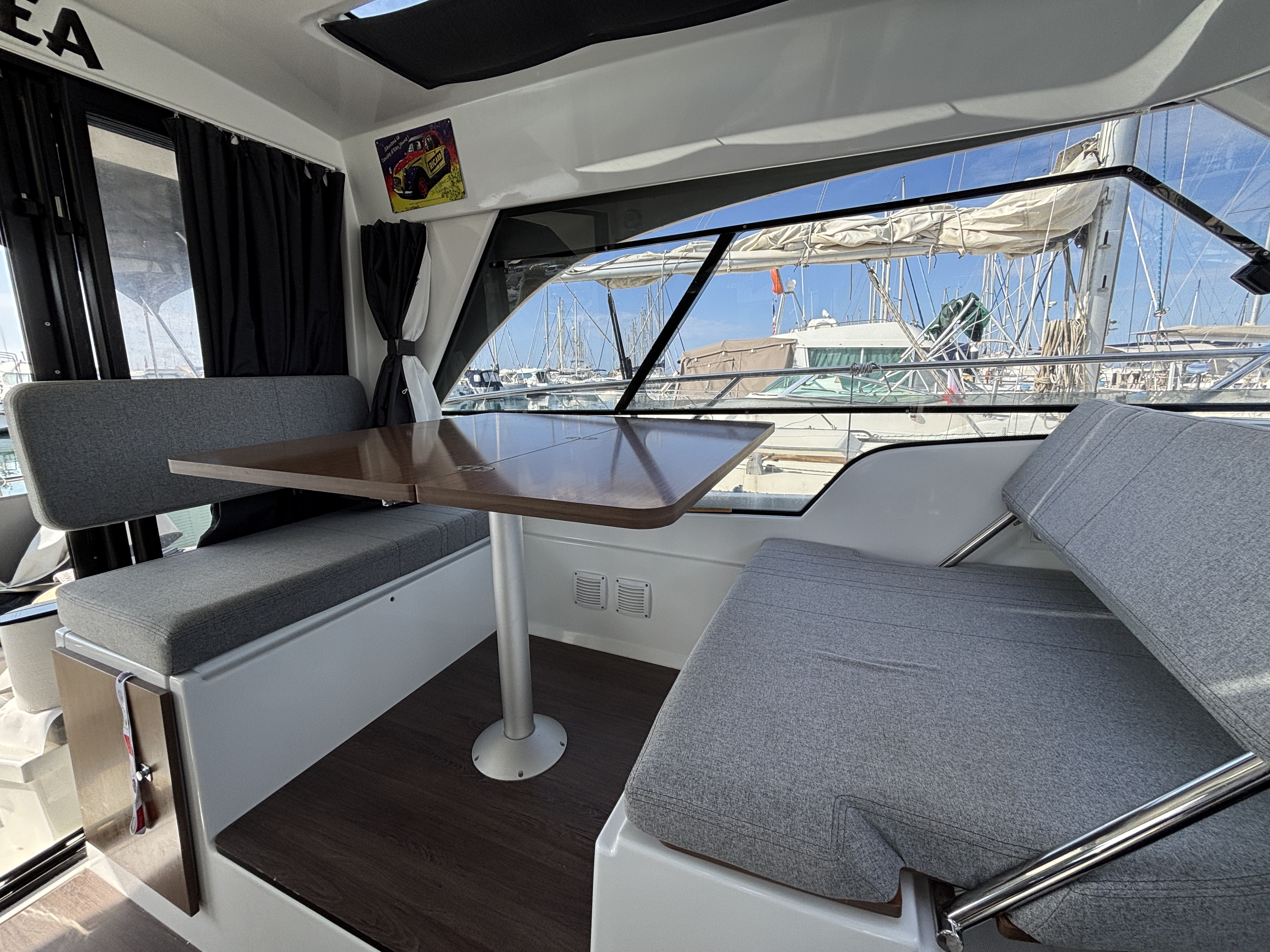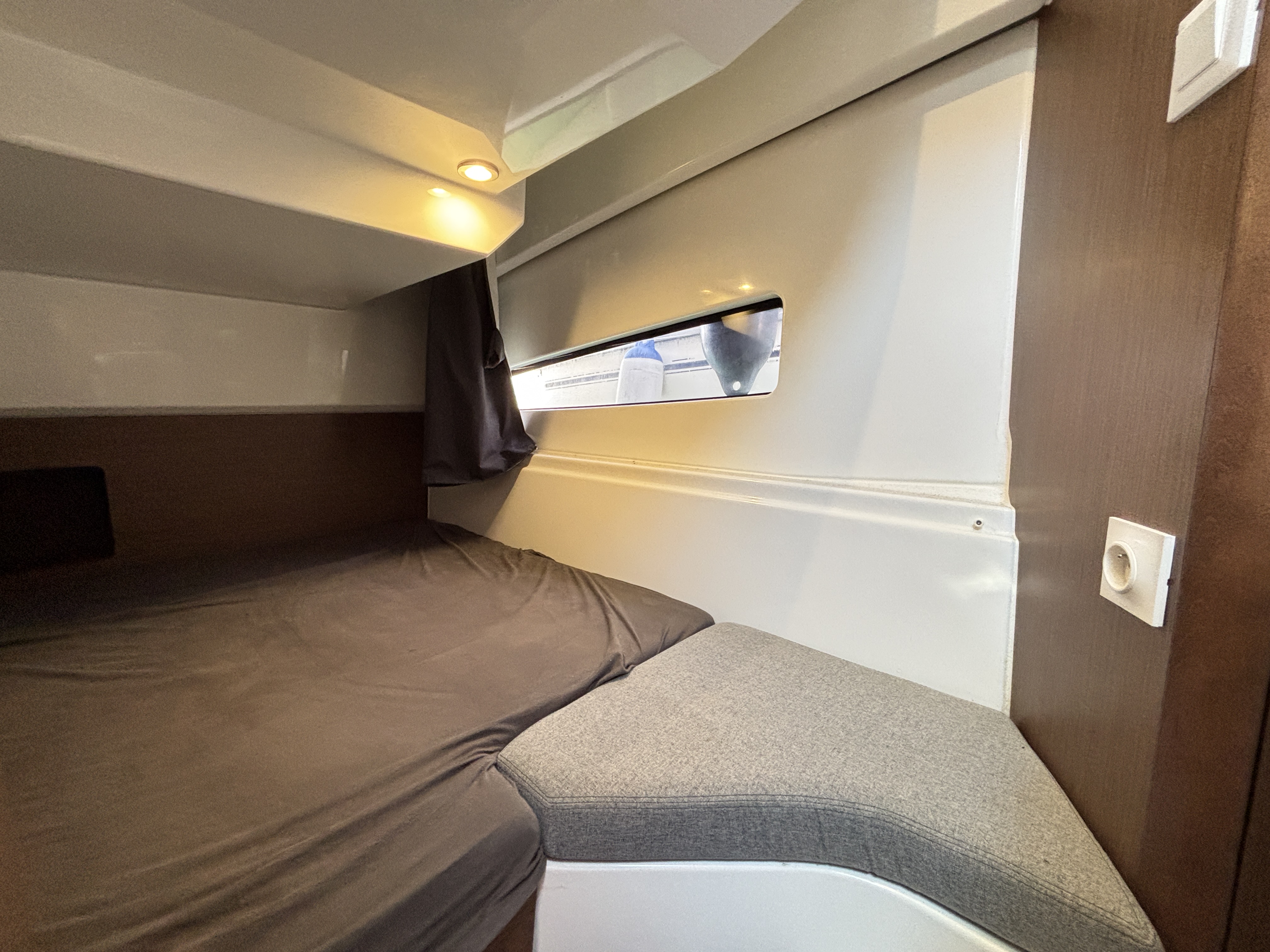 L’espace intérieur est lumineux et confortable avec carré transformable, cuisine équipée et cabine double, offrant un véritable confort de croisière. Cockpit modulable parfait pour la pêche ou la détente.